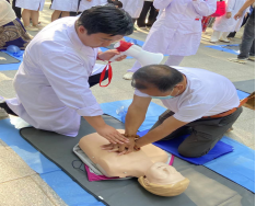 首先,由校企共育实验班学生曲彬讲解心肺复苏要点,包括按环境评估、患者病情评估、按压部位、按压频率及按压深度等,并由学生们展示单人徒手心肺复苏术。随后,在学生的指导下全院职工、市民们进行实践演练。